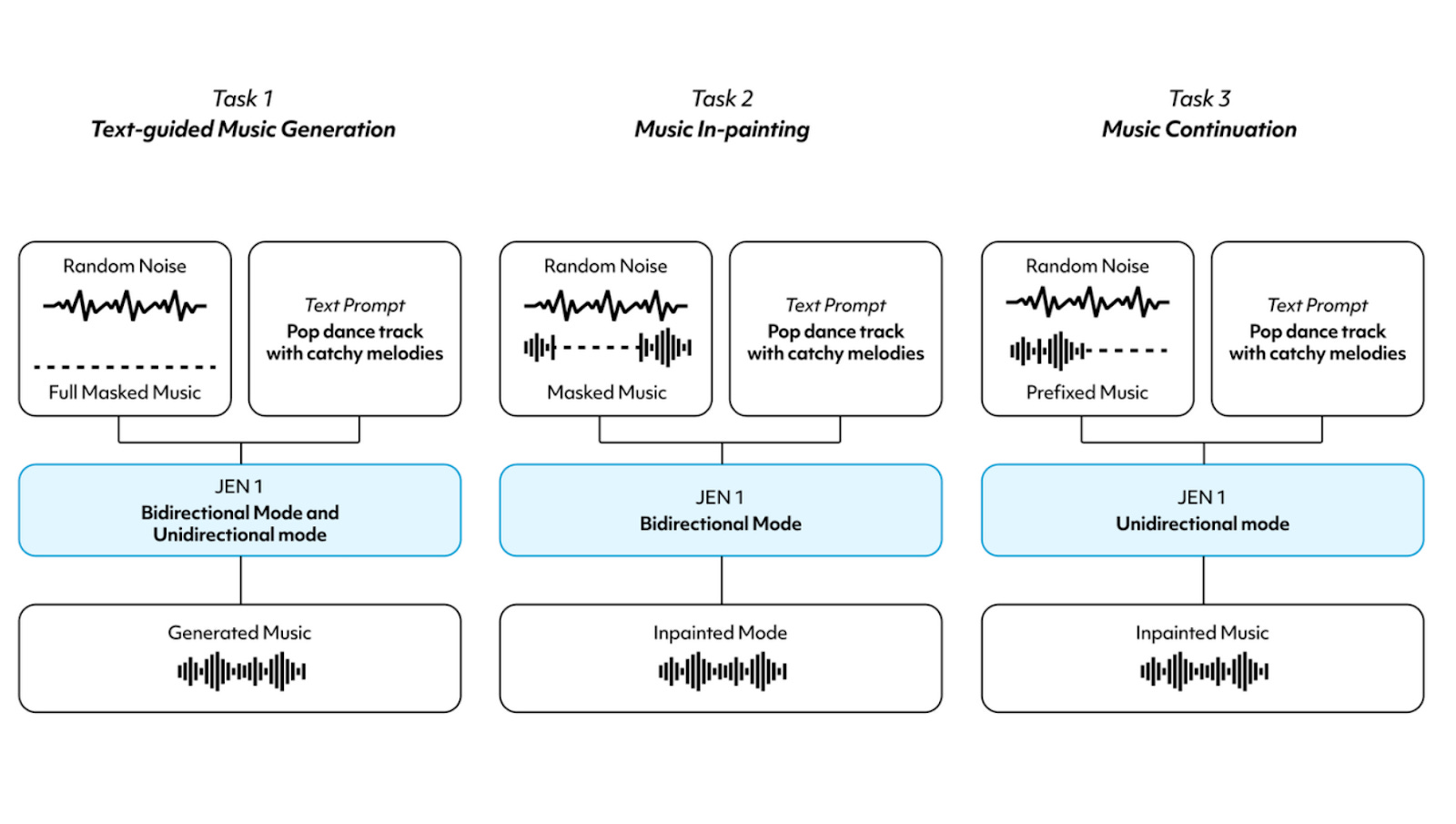 Co-designed with music industry insiders, Jen-1 supports musicians in song completion with features like 'continuation' and 'in-painting', providing assistance in finishing or mending incomplete tracks, thus extending human artistic creativity.