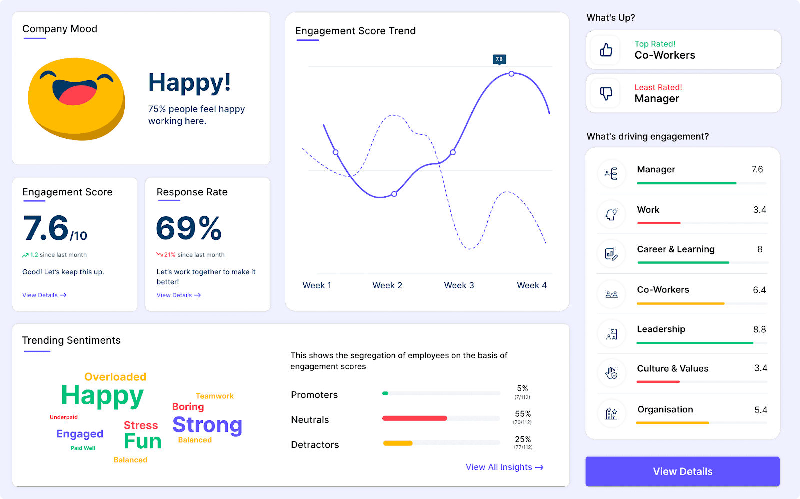 Best for: Distributed and remote teams. It empowers HRs and team leaders to gather real-time data points for actionable insights. It's the perfect tool for companies looking to prioritize their employees' well-being and adapt to evolving needs of modern teams.