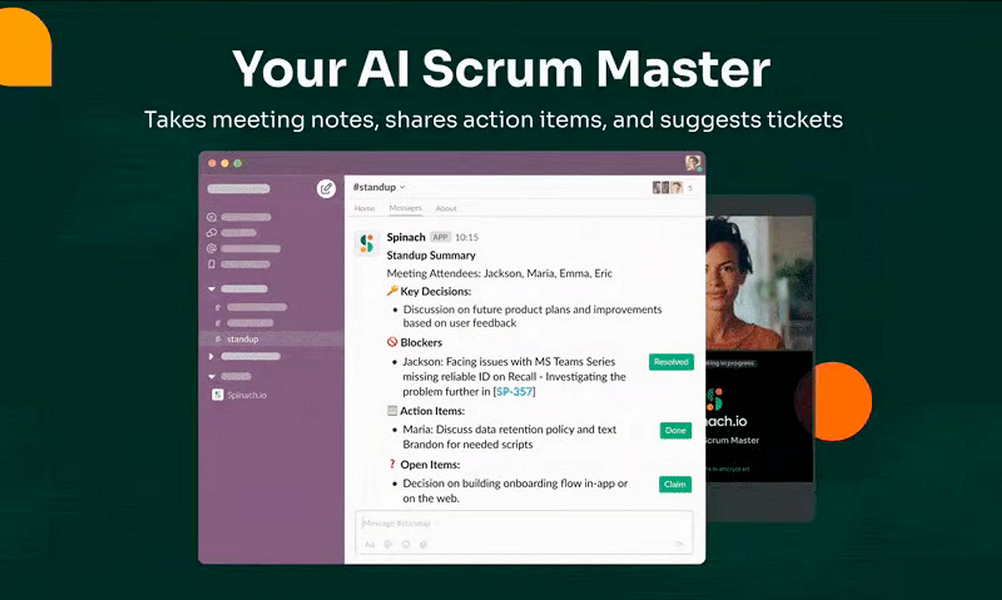 2. Spinach.io is a virtual AI Scrum Master. GPT-4 powered teammate that nails meeting notes, follows up with action items and ticket suggestions in Slack.