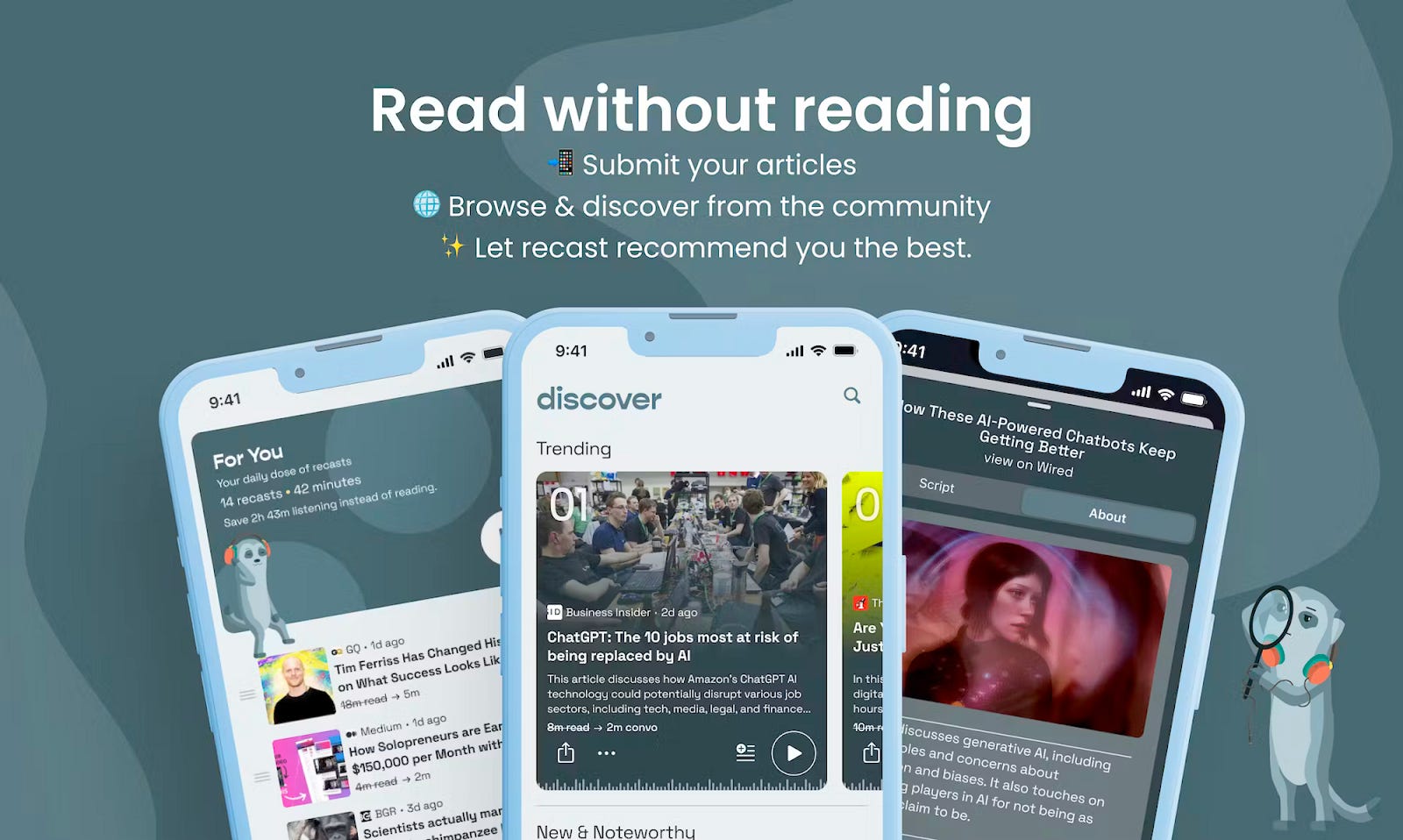 Features: Convert articles to podcasts, real dialogue co-hosts, submit or browse community recasts, save screen time.